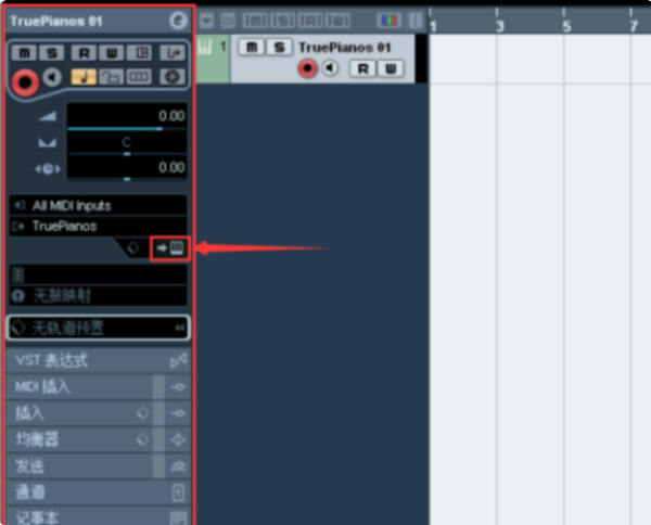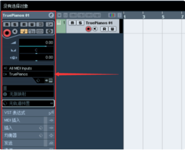 5、通过这种方式,一个声源被成功地安装在一个新的轨道上。图中的红框位置是当前选定轨道的控制条。如果您想用另一个声源重新挂载此音轨,请单击箭头指向的位置。