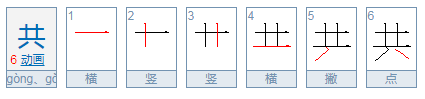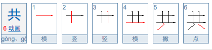 释义: [ gòng ] 1、相同,一样:共性、共同、同甘共苦。 2、彼此都具有、使用或承受:患难与共、休戚与共。 3、一起,一齐:共鸣、共勉、共议、共处(chǔ)。 4、总计,合计:共计、总共。 5、与,和。 6、“共产党”的简称。 [ gōng ] 1、古同“恭”,恭敬。 2、古同“供”,供奉,供给。 扩展资料 共组词:公共、一共、与共、统共、国共、同共、靖共、相共、大共、小共、参共、敬共、撒共、懿共、弟共,具体解释如下: 1、公共:[gōng gòng] 属性词。属于社会的;公有公用的:公共卫生。公共汽车。公共场所。爱护公共财产。 2、一共:[yī gòng] 表示合在一起:三个小组一共是十七个人。 3、共处:[gòng chǔ] 相处;共同存在:共处一室。和平共处。 4、共同:[gòng tóng] 属性词。属于大家的;彼此都具有的:共同点。共同语言。搞好经济建设是全国人民的共同心愿。 5、总共:[zǒng gòng] 一共:他家总共三口人,我们场里总共养了两千多头奶牛。 暴走少女的回答共字的笔顺是横、竖、竖、横、撇、点,共六画。如图: