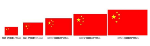 扩展资料: 中国人民政治协商会议《关于中华人民共和国国都、纪年、国歌、国旗的决议》和政协主席团通过的制旗办法规定:中华人民共和国国旗为五星红旗,长方形,红色象征革命,其长与高为三与二之比,旗面左上方缀黄色五角星五颗,象征共产党领导下的革命大团结,星用黄色象征红色大地上呈现光明。 一星较大,其外接圆直径为旗高3/10,居左;四星较小,其外接圆直径为旗高1/10,环拱于大星之右侧,并各有一个角尖正对大星的中心点,表达亿万人民心向伟大的中国共产党,如似众星拱北辰。旗杆套为白色,以与旗面的红色相区别。 国旗之通用尺度定为如下五种,各界酌情选用: (1)长288厘米,高192厘米。 (2)长240厘米,高160厘米。 (3)长192厘米,高128厘米。 (4)长144厘米,高96厘米。 (5)长96厘米,高64厘米。 参考资料:百度百科_中华人民共和国国旗 徐小小奔的回答:旗帜的标准尺寸: 2号旗:240X160CM 3号旗:192X128CM