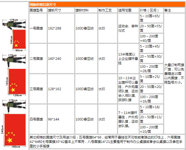 挖挖挖914的回答:1、国旗的标准尺寸有:2号旗尺寸160*240、3号旗尺寸:128*192 。 2、常见的旗帜尺寸有:1号旗尺寸192*288、2号旗尺寸160*240、3号旗尺寸128*192、4号旗尺寸96*144、5号旗尺寸64*95、6号旗尺寸40*60等。 企业升降国旗和企业旗帜的规定 国旗与其它旗帜同时升挂时,应将国旗置于中心,较高或突出的位置;同时悬挂多面国家国旗时,旗帜排列顺序按国名第一个英文字母排列。 3、由保安每周进行一次国旗或厂旗的升降,升旗时间每周一7:00,降旗每周日17:00。 4、升降国旗或厂旗时,由公司保安阻止2-3人进行。要立正脱帽行注目礼,升旗一定要升至杆顶。悬挂双方国旗,按国际惯例,以右为上,左为下。两国国旗并挂,以旗本身面向为准,右挂客方国旗,左挂本国国旗。