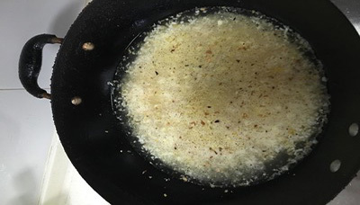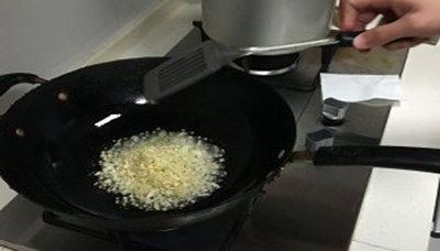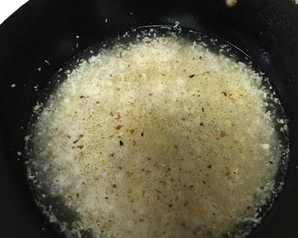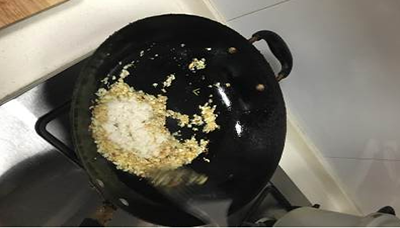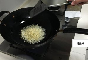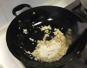2、等到蒜香出来后倒入酒糟和黄灯笼辣椒酱,然后用中火翻炒。