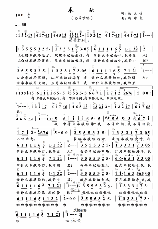 参考资料来源:百度百科—奉献 参考资料来源:百度百科—苏芮 乐观的高飞123的回答奉献 歌曲原唱:苏芮 填 词:杨立德 谱 曲:翁孝良 长路奉献给远方,玫瑰奉献给爱情 我拿什么奉献给你,我的爱人 白云奉献给草场,江河奉献给海洋 我拿什么奉献给你,我的朋友 我拿什么奉献给你,我不停的问 我不停的找,不停的想 白鸽奉献给蓝天,星光奉献给长夜 我拿什么奉献给你,我的爱人 雨季奉献给大地,岁月奉献给季节 我拿什么奉献给你,我的朋友