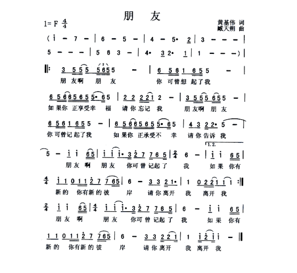 乐观的高飞123的回答《朋友》 歌手:臧天朔 曲:臧天朔 词:黄集伟 朋友啊朋友,你可曾想起了我 如果你正享受幸福,请你忘记我 朋友啊朋友,你可曾记起了我 如果你正承受不幸,请你告诉我 朋友啊朋友,你可曾想起了我 如果你正享受幸福,请你忘记我 朋友啊朋友,你可曾记起了我 如果你正承受不幸,请你告诉我 朋友啊朋友,你可曾记起了我 如果你有新的,你有新的彼岸,请你离开我离开我 朋友啊朋友,你可曾想起了我 如果你正享受幸福,请你忘记我 朋友啊朋友,你可曾记起了我 如果你正承受不幸,请你告诉我 朋友啊朋友,你可曾记起了我 如果你有新的,你有新的彼岸,请你离开我离开我 朋友啊朋友,你可曾记起了我 如果你有新的,你有新的彼岸 请你离开我离开我,朋友啊朋友 你可曾记起了我,如果你有新的 你有新的彼岸,请你离开我离开我 扩展资料:《朋友》是臧天朔作曲并演唱的歌曲,由黄集伟作词,收录在专辑《冲入禁区》中,臧天朔成名曲。是首很具讽刺意味的歌曲,表达了自己在困难中朋友不该放弃自己的想法。 相关新闻: 歌手臧天朔于2018年9月28日凌晨去世了,享年54岁。一首《朋友》让他红遍大江南北。 《朋友》是首很具讽刺意味的歌曲,很多70后、80后都能哼唱那句有名的歌词:“朋友啊朋友,你可曾想起了我,如果你正享受幸福,请你忘记我;朋友啊朋友,你可曾记起了我,如果你正承受不幸,请你告诉我;朋友啊朋友,你可曾记起了我,如果你有新的,你有新的彼岸,请你离开我离开我。” 这首歌似乎在讲朋友的江湖义气,“有难同当,有福可以不同享”,也说了一个非常朴实的道理:天下没有不散的宴席,天下没有不散的朋友。在通过《朋友》一曲走红后,臧天朔便没有其他作品。他几乎放弃了自己的唱歌事业,进入了生意场。而在生意中,他成了《朋友》中的主角。 CY_cyu的回答歌名:《朋友》 演唱:臧天朔 作词:黄集伟 作曲:臧天朔 歌词: 朋友啊朋友, 你可曾想起了我 如果你正享受幸福, 请你忘记我 朋友啊朋友, 你可曾记起了我 如果你正承受不幸, 请你告诉我 朋友啊朋友, 你可曾想起了我 如果你正享受幸福, 请你忘记我 朋友啊朋友, 你可曾记起了我 如果你正承受不幸, 请你告诉我 朋友啊朋友, 你可曾记起了我 如果你有新的, 你有新的彼岸 请你离开我离开我, 朋友你现在还好吗 好久不见, 不知在远方的你 是否还记得我, 朋友啊朋友 你可曾想起了我, 如果你正享受幸福 请你忘记我, 朋友啊朋友 你可曾记起了我, 如果你正承受不幸 请你告诉我, 朋友啊朋友 你可曾记起了我, 如果你有新的 你有新的彼岸, 请你离开我离开我 朋友啊朋友, 你可曾记起了我 如果你有新的, 你有新的彼岸 请你离开我离开我, 朋友啊朋友 你可曾记起了我, 如果你有新的 你有新的彼岸, 请你离开我离开我 扩展资料: 《朋友》,由黄集伟作词,臧天朔作曲并演唱的歌曲。收录在专辑《冲入禁区》中,发行于1987年,臧天朔成名曲。该歌曲很具讽刺意味的歌曲,表达了自己在困难中朋友不该放弃自己的想法。 歌曲简谱: 参考资料来源:百度百科—朋友 子曰非衣的回答朋友 - 周峰 作词:黄集伟 作曲:臧天朔 朋友啊朋友 你可曾想起了我 如果你正享受幸福 请你忘记我 朋友啊朋友 你可曾记起了我 如果你正承受不幸 请你告诉我 朋友啊朋友 你可曾想起了我 如果你有新的 你有新的彼岸 请你离开我离开我 朋友啊朋友 你可曾想起了我 如果你正享受幸福 请你忘记我 朋友啊朋友 你可曾记起了我 如果你正承受不幸 请你告诉我 朋友啊朋友 你可曾记起了我 如果你有新的 你有新的彼岸 请你离开我离开我 朋友啊朋友 你可曾记起了我 如果你有新的 你有新的彼岸 请你离开我离开我 拓展资料代表作品 《朋友》、《等待那一天》、《大悲咒》、《心的祈祷》 主要成就 中国第一代摇滚音乐人、推动摇滚乐在国内发展 你大爷ZzCt的回答歌曲名:朋友歌手:臧天朔 专辑:中国歌典 1990's 突飞猛进的时代 朋友 曲:臧天朔 词:黄集伟 朋友啊朋友 你可曾想起了我 如果你正享受幸福 请你忘记我 朋友啊朋友 你可曾记起了我 如果你正承受不幸 请你告诉我 朋友啊朋友 你可曾想起了我 如果你正享受幸福 请你忘记我 朋友啊朋友 你可曾记起了我 如果你正承受不幸 请你告诉我 朋友啊朋友 你可曾记起了我 如果你有新的 你有新的彼岸 请你离开我离开我 朋友啊朋友 你可曾想起了我 如果你正享受幸福 请你忘记我 朋友啊朋友 你可曾记起了我 如果你正承受不幸 请你告诉我 朋友啊朋友 你可曾记起了我 如果你有新的 你有新的彼岸 请你离开我离开我 朋友啊朋友 你可曾记起了我 如果你有新的 你有新的彼岸 请你离开我离开我 朋友啊朋友 你可曾记起了我 如果你有新的 你有新的彼岸 请你离开我离开我 http://music.baidu.com/song/59587226 |