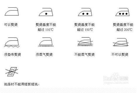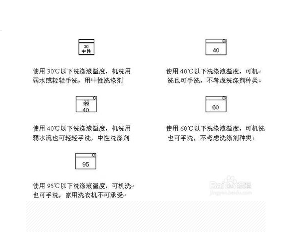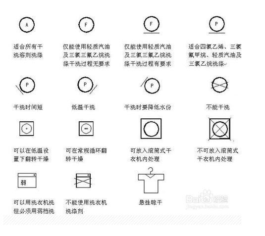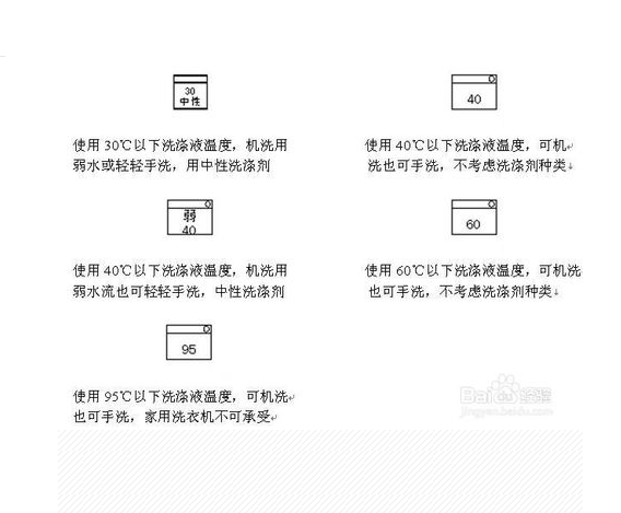 扩展资料: 衣服洗涤注意事项: 1、浅色面料建议单独冷水洗涤,避免和其他衣服被染色。避免机洗甩干暴力损害衣服。 2、中性洗涤剂浸泡不要超过5分钟,轻柔手洗,如果白色部分不小心弄脏了需要泡久点的话建议单独浸泡脏的地方,衣领部分不用放在水盆里。 3、请勿使用搓板搓洗以免损伤表面,洗好后轻轻挤去水分。在阴凉通风处反面晾干哈,不宜太阳暴晒太久影响光泽。 4、衣服在运输途中不可避免会再次弄皱,拿到以后低温熨烫一下再穿。 zyy452904652的回答:常见的洗衣服的洗涤标志如下(图片1—3): 图片1、