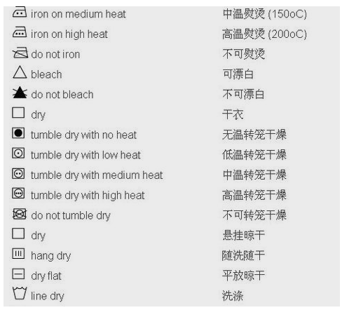 勤奋的龙太子35的回答:这些符号已经被分解成5个基本要素,即“洗涤”“漂白”“干燥”“熨烫”和“警告”,有时候会用数字或者一个点来代表温度的变化。 |