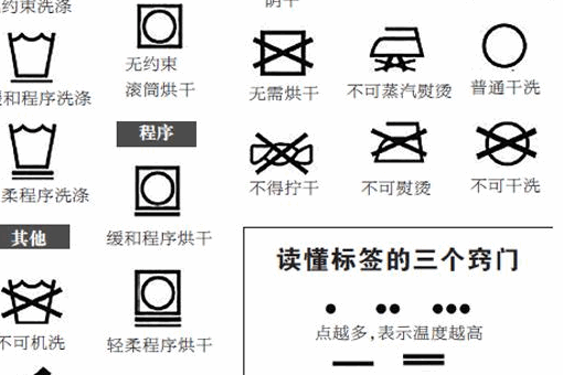 衣服上的洗涤符号好比衣服的“护身符”。一般的衣服都有这样的标识,这样以图文并茂的形式,就能读懂衣服标签上的“洗衣密码”。