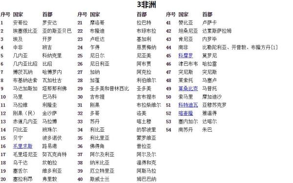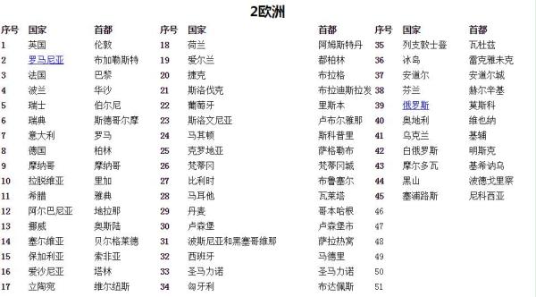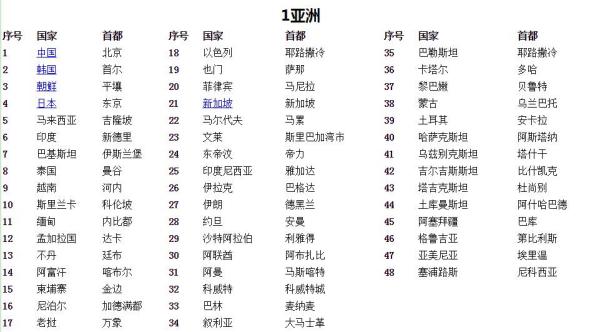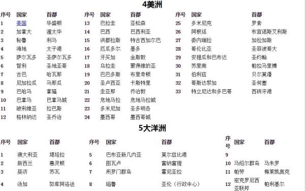 扩展资料: 1、无首都国家: 城国,如新加坡、梵蒂冈等,没有首都。瑙鲁是全世界最小的岛国,面积只有21平方公里,没有首都,行政机关在亚伦区。 2、多首都国家: 阿姆斯特丹是荷兰的法定首都,但荷兰政府、议会、最高法院及国王的皇宫均位于海牙。韩国行政首都为世宗特别自治市,首尔是中央政府所在地。 3、外首都: 贝专纳兰,今博茨瓦纳,前英国保护领地,曾受领土以外的首都马菲京管治,情况实属罕见。 参考资料来源:百度百科-首都 匿名用户的回答:国家country 首都(capital)阿富汗 Afghanistan 喀布尔 Kabul 孟加拉国 Bangladesh 达卡 Dhaka 不丹 Bhutan 廷布 Thimphu 缅甸 Burma 仰光 Rangoon 柬埔寨 Cambodia 金边 Phnom Penh 中国 China 北京 Beijing/香港 Hong Kong/台湾 Taiwan/澳门 Macau 印度 India 新德里 New Delhi 印度尼西亚 Indonesia 雅加达 Jakarta 日本 Japan 东京 Tokyo 老挝 Laos 万象 Vientiane 马来西亚 Malaysia 吉隆坡 Kuala Lumpur 马尔代夫 Maldives 马累 Male (Maale) 蒙古 Mongolia 乌兰巴托 Ulaanbaatar 尼泊尔 Nepal 加德满都 Kathmandu 朝鲜 North Korea 平壤 P'yongyang 巴基斯坦 Pakistan 伊斯兰堡 Islamabad 菲律宾共和国 Philippines 马尼拉 Manila 新加坡 Singapore 新加坡 Singapore 韩国 South Korea 首尔 Seoul 斯里兰卡 Sri Lanka 科伦坡 Colombo 泰国 Thailand 曼谷 土耳其 Turkey 安卡拉 Ankara 越南 Vietnam 河内 Hanoi 文莱 斯里巴加湾市 巴勒斯坦 Palestine 无 锡金 Sikkim 甘托克 世界各国及首府中英文对照-欧洲 国家(coutry) 首都名称(capital) 阿尔巴尼亚 Albania 地拉那 Tirana 奥地利 Austria 维也纳 Vienna 比利时 Belgium 布鲁塞尔 Brussels 保加利亚 Bulgaria 索非亚 Sofia 克罗地亚 Croatia 萨格勒布 Zagreb 塞浦路斯 Cyprus 尼克西亚 Nicosia 丹麦 Denmark 哥本哈根 Copenhagen 芬兰 Finland 赫尔辛基 Helsinki 法国 France 巴黎 Paris 德国 Germany 柏林 Berlin 希腊 Greece 雅典 Athens 匈牙利 Hungary 布达佩斯 Budapest 冰岛 Iceland 雷克亚未克 Reykjavik 爱尔兰 Ireland 都柏林 Dublin 意大利 Italy 罗马 Rome 列支敦士登 Liechtenstein 瓦杜兹 Vaduz 卢森堡 Luxembourg 卢森堡 Luxembourg 马其顿 Macedonia Skopje 马耳他 Malta 瓦莱塔 Valletta 摩纳哥 Monaco 摩纳哥 Monaco 荷兰 Netherlands 阿姆斯特丹 Amsterdam 挪威 Norway 奥斯陆 Oslo 波兰 Poland 华沙 Warsaw 葡萄牙 Portugal 里斯本 Lisbon 罗马尼亚 Romania 布加勒斯特 Bucharest 俄罗斯 Russia 莫斯科 Moscow 圣马利诺 San Marino 圣马力诺 San Marino 斯洛文尼亚 Slovenia Ljubljana 西班牙 Spain 马德里 Madrid 瑞典 Sweden 斯德哥尔摩 Stockholm 瑞士 Switzerland 伯尔尼 Bern 大不列颠联合王国 伦敦 London United Kingdom 南斯拉夫 Yugoslavia 贝尔格莱德 Belgrade 世界各国及首府中英文对照-大洋州 国家(country) 首都(capital) 澳大利亚 Australien 堪培拉 Canberra 斐济 Fidschi 苏瓦 Suwa 基里巴斯 Kiribati 塔拉瓦 Tarawa 瑙鲁 Nauru 亚伦 Yaren 新西兰 Neuseeland 惠灵顿 Wellington 巴布亚新几内亚 莫尔兹比港 Moreaby Papua-Neuguinea Port 所罗门群岛 Salomonen 霍尼亚拉 Honiara 汤加 Tonga 努库阿洛法 Nuku′alofa 瓦努阿图 Vanuatu 维拉港 Vila 西萨摩亚 Westsamoa 阿皮亚 Apia 世界各国及首府中英文对照-美洲 国家(Country) 首都(capital) 安圭拉岛 Anguilla The Valley 安提瓜岛Antigua and Barbuda 圣约翰 Saint John's 阿根廷 Argentina 布宜诺斯艾利斯 Buenos Aires 巴哈马 The Bahamas 拿骚 Nassau 巴巴多斯岛 Barbados 布里奇顿 Bridgetown 伯利兹 Belize 贝尔莫潘 Belmopan 百慕大群岛 Bermuda 哈密尔顿 Hamilton 玻利维亚 Bolivia 拉巴斯 La Paz 巴西 Brazil 巴西利亚 Brasilia 英属维尔京群岛 罗德城 Road Town British Virgin Islands 加拿大 Canada 温哥华 Ottawa 智利 Chile 圣地亚哥 Santiago 哥伦比亚 Colombia 巴哥达 Bogota 哥斯达黎加 Costa Rica 圣约瑟 San Jose 古巴 Cuba 哈瓦那 Havana 多米尼加 圣多明各 Santo Domingo Dominican Republic 厄瓜多尔 Ecuador 基多 Quito 萨尔瓦多 El Salvador 圣萨尔瓦多 San Salvador 格陵兰 Greenland Nuuk (Godthab) 格林纳达 Grenada 圣乔治 Saint George's 瓜德罗普岛 Guadeloupe 巴斯特尔 Basse-Terre 危地马拉 Guatemala 危地马拉 Guatemala 圭亚那 Guyana 乔治敦 Georgetown 海地 Haiti 太子港 Port-au-Prince 洪都拉斯 Honduras 特古巴加尔巴 Tegucigalpa 牙买加 Jamaica 金斯敦 Kingston 马提尼克岛 Martinique 法兰西堡 Fort-de-France 墨西哥 Mexico 墨西哥城 Mexico 蒙特塞拉特岛 Montserrat 普利茅斯 Plymouth 尼加拉瓜 Nicaragua 马那瓜 Managua 巴拿马 Panama 巴拿马城 Panama 巴拉圭 Paraguay 亚松森 Asuncion 秘鲁 Peru 利马 Lima 波多黎各岛 Puerto Rico 圣胡安 San Juan 圣卢西亚岛 St. Lucia 卡斯特里 Castries 圣文森特岛 金斯敦 Kingstown St. Vincent and the Grenadines 苏里南 Suriname 帕拉马里博 Paramaribo 特立尼达和多巴哥 西班牙港 Port-of-Spain Trinidad and Tobago 特克斯群岛和凯科斯群岛 大特克 Grand Turk Turks and Caicos Islands 美国 United States 华盛顿 Washington, DC 乌拉圭 Uruguay 蒙得维的亚 Montevideo 委内瑞拉 Venezuela 加拉加斯 Caracas 美属维尔京群岛 夏洛特阿马利亚 Charlotte Amalie Virgin Islands 世界各国及首府中英文对照-非洲 国家(Country) 首都(capital) 阿尔及利亚 Algeria 阿尔及尔 Algiers 安哥拉 Angola 罗安达 Luanda 贝宁 Benin 波多诺夫 Porto-Novo 博茨瓦纳 Botswana 哈伯罗内 Gaborone 布隆迪 Burundi 布琼布拉 Bujumbura 喀麦隆 Cameroon 雅温得 Yaounde 中非 班吉 Bangui Central African Republic 乍得 Chad 恩贾梅纳 N'Djamena 刚果共和国 Congo Rep. 布拉柴维尔 Brazzaville 吉布提共和国 Djibouti 吉布提 Djibouti 埃及 Egypt 开罗 Cairo 赤道几内亚Equatorial Guinea 马拉博 Malabo 