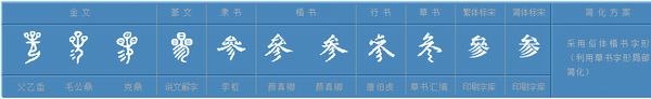 二、字源解说 文言版《说文解字》:参,商星也。 白话版《说文解字》:参,曑和商,都是星名。字形采用“晶”作边旁。 三、相关组词 1、参拜[cān bài] :以一定的礼节进见敬重的人或瞻仰敬重的人的遗像、陵墓等:大礼参拜。孔庙。 冰心 《南归》:“在你重过飘泊的生涯之先,第一次参拜了慈亲的坟墓之后,我才来动笔!” 2、参谋[cān móu]:代出主意的人;代人出主意。 浩然 《艳阳天》第六三章:“一个糊里糊涂的老头子,当什么参谋!” 3、参差[cēn cī] :不齐貌,长短、高低不齐的样子。 朱自清 《荷塘月色》:“月光是隔了树照过来的,高处丛生的灌木,落下参差的斑驳的黑影,峭楞楞如鬼一般。” 4、参伍[cēn wǔ] :参插。 《荀子》曰:“窥敌制变,欲伍以参”。窥敌制变:偷偷侦察战场上敌军编制队形的调动和变化情况。欲伍以参:企图、准备将自己的队伍、兵力穿插、加入战斗中。 5、人参[rén shēn] 多年生草本植物。掌状复叶,果鲜红色。根可供药用,能大补元气,是强壮、兴奋药。在中国产于东北长白山区,现其他地区也有栽培。是中国国家重点保护植物。参(shēn)。 hr523845的回答当读作can时,可组词为:参考、参加。当读作cen时,可组词为:参差。 当读作shen时,可组词为:海参、人参、西洋参。 龙之腾必潜乃翔的回答参