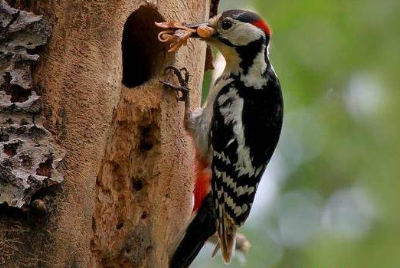 啄木鸟是著名的森林医生它们吃的有甲虫、毛虫、天牛、蜘蛛、蚂蚁等害虫。一对啄木鸟往往能“保卫”几十亩面积的树木免受害虫侵袭。啄木鸟的身体构造,完全适应于捕捉钻进树里的害虫。一般的鸟类都足生四趾,三趾朝前,一趾向后;而啄木鸟的四趾平均分配,前后个两趾,各趾均有锐爪,能在树上垂直攀爬;它的尾巴构造也不同一般,呈楔形,羽轴硬而富有弹性。在树上攀爬和用嘴敲击时,尾巴是个坚强的支柱。象听诊器一样的钢嘴,通过敲树作声,能准确的巡捕到蛀虫。 啄木鸟的舌头工作非常特殊。它的长舌能伸出口外达14厘米。舌尖上能分泌粘液,并且还生有锋利的倒钩,连钩带粘,害虫休想逃脱。 |