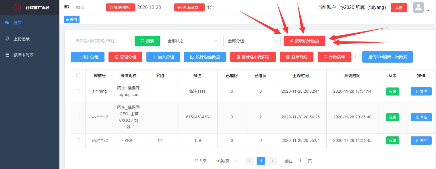 功能介绍1、一台电脑一个计数器可以登录多个VX号。 2、如需多台电脑的登录的VX号汇总在一个统计后台,联系客服定制,按电脑台数收费。 3、可以统计单双项好友功能。软件自带同意好友功能 (但是不建议用) 4、可以生成统计链接,发送给第三方实时查看上粉数据和帐号状态 5、在网页端可以给VX号进行分组,可以分享指定组的统计链接 6、可以给每个VX号单独备注信息 7、一键删除离线VX号 8、自动记录所有粉丝帐号,可查看粉丝加了哪个目标号。 9、【上粉记录】只要不删除,永久保存在此软件帐号上 10、自动过滤重复好友,只要跟【上粉记录】有重复的粉丝就会自动过滤,并且显示在过滤数中。 |