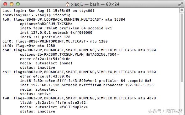 如果获取Mac的IP地址启动Terminal, 输入命令 "ifconfig"