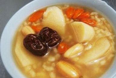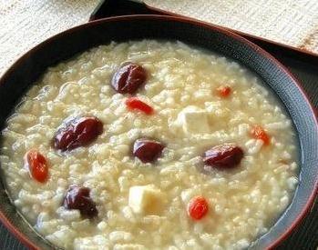 食材:枸杞10g、大枣50g、山药200g、花生50g、冰糖50g、大米100g 做法:1)山药切块,枸杞,大枣,花生,洗净2)大枣预处理,先下开水中,煮到变色,熟透,再取出,去栆把儿,处理好的大枣,再熬粥,就不会有苦味3)大米,煮好的大枣,山药,枸杞,花生,冰糖,加进锅里4)电压力锅,煮粥档。 芝麻杏仁粥 食材:大米60g、黑芝麻粉10g、杏仁10g、糖适量 做法:1)大米适量2)淘洗干净3)将大米倒入锅中4)加入适量的水5)杏仁一小把6)将杏仁用热水浸泡十来分钟7)将杏仁去皮洗净8)将杏仁切碎9)待粥煮至黏稠,将杏仁倒入锅中10)待粥快要煮好时,加入一匙黑芝麻11)搅拌均匀12)加适量白糖调味 姜蓉金米海参粥 食材:小米50g、即食海参1个、胡萝卜适量、大葱适量、精盐适量、鸡精适量 做法:1)小米先泡好。2)即食海参用热水泡发。3)翻到海参背面,用刀划开一条条的小口。4)生姜去皮捣成蓉。胡萝卜大葱切小颗粒。5)小米煮滚,加姜蓉。6)加鸡精味精搅匀,撒上胡萝卜大葱末。7)小米粥盛入碗中,摆上切好的海参。 风寒感冒 防风粥 做法:防风(在药店可以买到)15克,葱白2根,生姜3片,大米50克。先将大米煮熟,快熟时加入防风、葱白和生姜,可适量加盐。 功效:该粥可清热祛风、散寒止痛,适用于风寒感冒引起的畏寒发热、骨节酸痛、鼻塞声重、肠鸣泻泄等病症。 荆芥粥 做法:荆芥9克,薄荷3克,淡豆豉9克,加水煮开,沸后5分钟,去渣取药汁,加入糯米100克煮粥。每日2次,温热服食。 功效:可发汗解表,清热利咽,退热除烦,适用于伤风感冒,发热恶寒,头痛,咽痛,心烦,失眠等。 生姜苏叶粥 做法:苏叶10克、生姜3片,将白粥熬好后放入,再开锅就可食用了。 功效:生姜是对付发烧、打喷嚏、咳痰等症状的最好“武器”,有祛痰、祛寒、补气、平喘的作用,苏叶也有发散风寒的效果,在一般药店就可买到。风寒感冒喝生姜苏叶粥很有效。 紫苏杏仁粥 做法:苏叶10克,杏仁(去皮、尖)5克,粳米50克,生姜3片,大枣3枚。先用粳米洗净煮粥,待临煮熟时,加入苏叶、杏仁、生姜、大枣,趁热喝粥。 功效:紫苏叶辛、温,可解表散风寒,又可理气宽中;生姜、大枣可调和营卫;杏仁下气止咳;粳米甘、平,健脾胃。合用可起到解表散寒、和胃、理气止咳的功效。 流行性感冒: 白萝卜茶叶粥 做法:白萝卜100克,茶叶5克,食盐适量。先将白萝卜洗净切片煮烂,加少许食盐,熬粥,再将茶叶用开水泡5分钟后倒入粥内。 功效:治流行性感冒。白萝卜能够清热化痰,茶叶可以清肺热,有理气开胃,止咳化痰之功效。