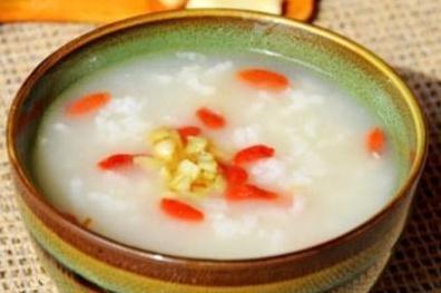 食材:粳米100g、枸杞10g、大蒜20g、香油适量、盐适量、鸡精少许 做法:1)准备好所有的食材。2)粳米洗净清水浸泡20分钟。3)枸杞清水浸泡。4)大蒜切末。5)沙锅中水烧开倒入粳米大火煮开小火熬至。6)炒锅加少许香油加热,把蒜末倒入出香味关火。7)这时米粥已经浓稠。8)加入蒜末搅拌。9)再加盐继续煮至5分钟。10)然后放入枸杞。11)加少许鸡精搅拌。12)淋入香油。13)搅拌均匀关火。 葱白大米粥 食材:大米100g、胡萝卜适量、葱白适量、生姜适量 做法:1)材料洗净备用2)胡萝卜切丝3)葱切段,姜切片4)大米提前泡二十分钟5)将大米放入高压锅内,加水,我的比例是三比一6)加入切好的胡萝卜丝,通电,按下熬粥选项开始工作7)大米和胡萝卜粥熬好以后,加入葱姜,接着再熬制十五分钟即可。 神仙粥 食材:糯米50g、葱根2段、姜5片、醋5ml、葱白2段 做法:1)糯米洗净放入砂锅,倒入适量的水2)开大火煮,煮开后拌下一防止粘锅。关小火熬3)葱取根和葱白洗净,姜切片4)当糯米熬成稠状的粥里加入葱白和姜再煮5分钟5)最后加入醋,拌匀即可。 枸杞大枣山药粥