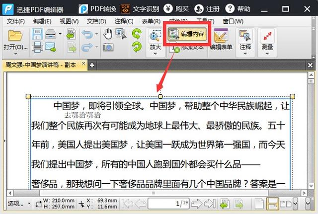 2、可以在软件的左边看到PDF文件的所有页面,点击需要编辑的一页,点击“编辑内容”选中文本。出现蓝色编辑框,拉动编辑框可以调节编文字范围。