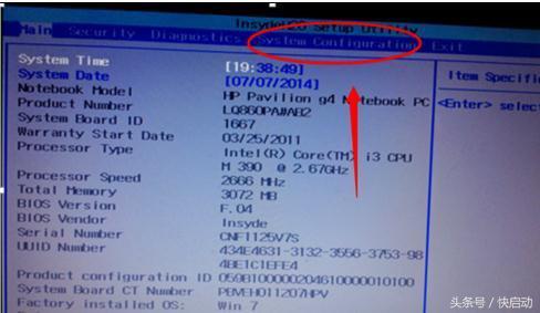 2、电脑是win7/win8/win10的话,支持的硬盘模式是ahci,如果你打算安装XP,需要将上图中 SATA Emulation 中的 AHCI状态,修改为 IDE。不懂的问题请关注快启动头条号询问小编哦。 3、要是打算进入BIOS设置从U盘启动,等待片刻之后,进入BIOS界面找到“system configuration”系统设置选项: