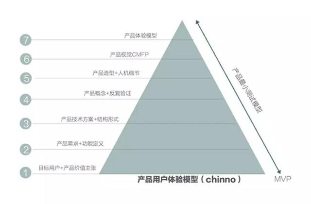 如果前期研究可以轻松回答以上问题,产品的策划基本完成。但是作为一名老司机温馨提示:研究过程不是直接去想创意,研究就是去「研」,去「究」,而不是去做。如果还没研究就先把创意做了,那么心就放不到问题的核心点上。 确定产品VP核心价值+产品定位就是前期研究工作的核心,一切围绕核心价值去工作,这是不可改变的,假设改变了那么需求也就跟着改变了。定义好要做什么样的产品和服务后,就可以快速进行下一阶段工作,构建产品用户体验模型。 四、在外观设计之前,不可缺少的四级层面。 产品的用户体验模型第一层是用户需求:我们的目标用户,他需求什么样的产品,要清晰表达产品的价值主张;第二层:用户需要什么样的功能,对产品功能进行定义;第三层:实现这些功能需求的产品技术方案、结构形式等等;到此我们已经有了产品的原理构思。第四层:结合一、二、三层进行产品概念创作,记住只是概念,并不包含外观设计,只要把产品的功能与体验模式理清楚,并反复验证概念想法,最后形成可行性的产品技术+结构+体验+功能等构想。第五层:产品造型设计,人机细节,功能排布等;第六层:CMFP设计。最后第七层:制作产品体验模型。一个产品从策划到设计的基本过程就完成。这时候就进行入MVP状态,进行用户测试,测试完成就到工程技术落地。