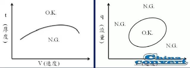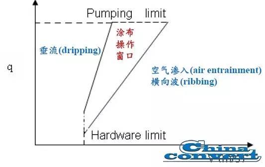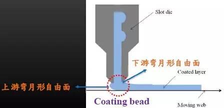 模头与滚筒间上游弯月形自由面(upstream meniscus)与下游弯月形自由面(downstream meniscus)内的液体– 数种物理力平衡的结果(重力、表面张力、黏滞力、惯性力、压力等) 涂布窗口(Coating window):一个可以稳定近型涂布操作的区间