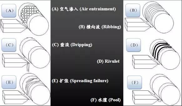 常见涂布缺陷有: (A) 空气渗入(Air entrainment) (B) 横向波(Ribbing) (C) 垂流(Dripping) (D) Rivulet (E) 扩张(Spreading failure) (F) 水漥(Pool)