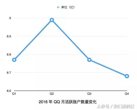 腾讯2016全年及Q4业务报告腾讯无论是营收还是净收入,同比增长40%。而腾讯旗下的QQ团队应该是不会开心的,因为在经历了18岁的成年礼以后,QQ被微信给超越了。 16年第四季度,腾讯QQ月活跃账号有8.68亿,比2015年同期增长2%,而微信与WeChat的合并,同时月活跃账号数有8.89亿,想必2015年同期增长28%. 我们从这些月活跃度来看,微信显然超越了QQ,并成为腾讯企业乃至于中国互联网的第一大服务社交应用。自微信2011年1月21日诞生以来,第一次在体量上超越QQ,短短6年间可以做到这样的成绩。 腾讯前三季度数据QQ月活跃用户数量分别为8.77亿、8.99亿8.77亿(按照季度顺序),第四季度月活跃降至8.68亿。