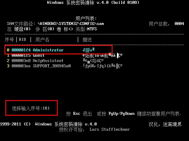 6.所列出的是这个文件内所记录下此电脑的所有账户信息。我们在此寻找需要清楚登录密码的账户,通常来说“administrator”用户是我们电脑上所常用的电脑账户。那么输入对应的序号0,之后按下回车键即可。下图为接上图之后按下回车键进入相关选项的界面,如下面图示: