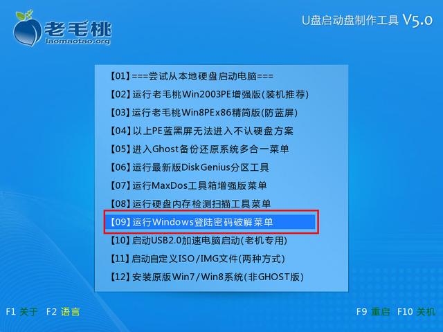 我们把开机的密码给忘记了,那么遇到这种情况我们该怎么办?今天小编教你使用老毛桃启动u盘清除系统登录密码的方法。 我们把开机的密码给忘记了,那么遇到这种情况我们该怎么办?今天小编教你使用老毛桃启动u盘清除系统登录密码的方法。 1.首先我们要准备一个制作好的u盘启动盘,把u盘插进电脑的usb接口,开机看到启动画面的时候连续按下快捷键进入老毛桃的主菜单界面,然后把光标移动到“【09】运行Windows登陆密码破解菜单”后按回车键,如下面图示: