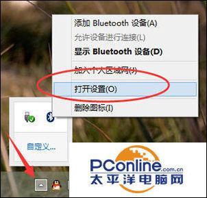 如今的笔记本电脑大多带有蓝牙功能,通过蓝牙传输文件,播放音乐等都很方便,不过各个品牌或型号不一样,设置有也有所不同。ThinkPad笔记本蓝牙没有硬件开关,主要通过系统来控制,系统默认处于开启状态,但需要通过简单设置才能连接。具体设置如下 1. 在win8系统桌面任务栏右下角,点“小三角”图标(显示隐藏的图标),打开后可以看到蓝牙图标,右键“打开设置”。