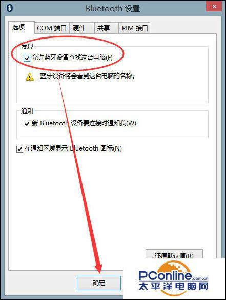 2. 弹出“Bluetooth设置窗口”,“选项”下勾选“允许蓝牙设备查找这台电脑”后点击“确定”。