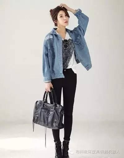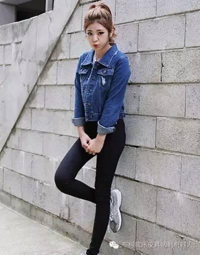 韩版风格的牛仔外套,做旧的设计,穿在身上复古迷人,带点小清新味道。内搭条纹T恤衫,下穿黑色紧身裤,搭配球鞋和棕色单肩包,吸晴无数。