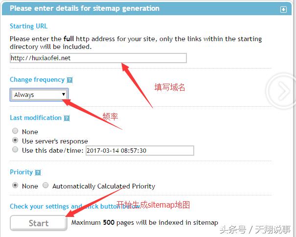 蜘蛛地图: 制作蜘蛛地图可以让蜘蛛更加了解你的网站情况,以方便蜘蛛可以抓取到更加深层次的链接。从而提升网站的收录,具体设置请看下图 第一步:打开网址 https://www.xml-sitemaps.com 生成sitemap.xml