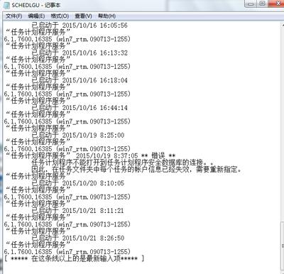 6.在打开的SCHEDLGU记事本里,鼠标上下滑动滚动条就可以看到许许多多的的时间,任务计划程序等。(注:开机时间就是任务计划程序启动时间)