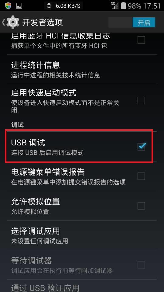 03 在开发者模式中,将USB调试打开。
