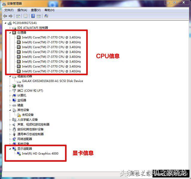 此外,除了以上方法也可以进入设备管理器里查看电脑配置信息,步骤:右击桌面上的“计算机”-->“设备管理器”,在设备管理器中就可以看见电脑配置情况了,如下图所示: