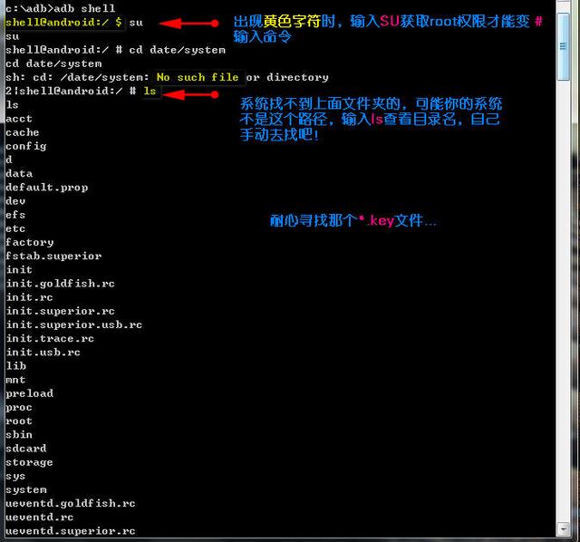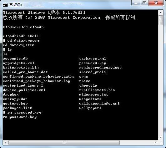 我们需要做的就是上图中,含有wipe的两项都给运行一遍就可以了。这样,手机就跟刚买来一样,里面数据都没了,密码也没了。虽然有些弊端,但是最为简单和方便的,那么就没有只去除密码而保留数据的么!? 第二种破解方法: 删除密码文档。 这个方法的原理和我们之前讨论破解Windows密码类似,PC系统的密码是存在Sam里的,而Android系统密码是存在password.key文件里面的。所以说,我们如果能删除掉这个文件,安卓系统的密码就迎刃而解了! root过系统或者刷过机的用户应该都知道ADB吧?这里我们也将用到它!命令如下: