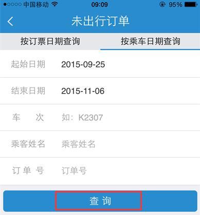 这时候,进入到未出行订单的查询页面,我们可以根据订票时间或者乘车时间来找到想要退订的火车票,这里建议使用乘车时间,毕竟现在火车票都是提前60天预订,比较难记得当时什么时间买的票,切换到乘车日期栏目之后,点击下方的起始日期,进行乘车时间的选择,在打开的乘车日期页面中,选择想要退票的当天乘车日期,乘车日期选择完毕之后,点击页面下方的查询按钮进行车票订单的查询