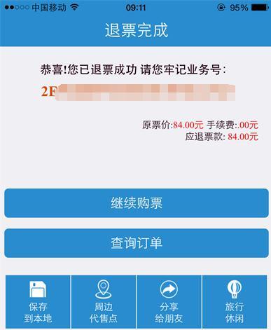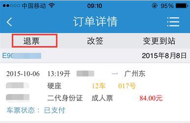 进入订单详情页面,在页面的顶部点击退票