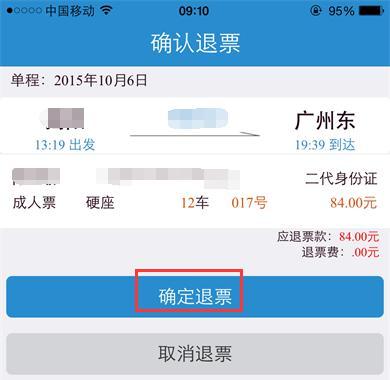这时,我们将可以看到订单详情下方有确认退票的按钮出现了,直接点击确认退票即可