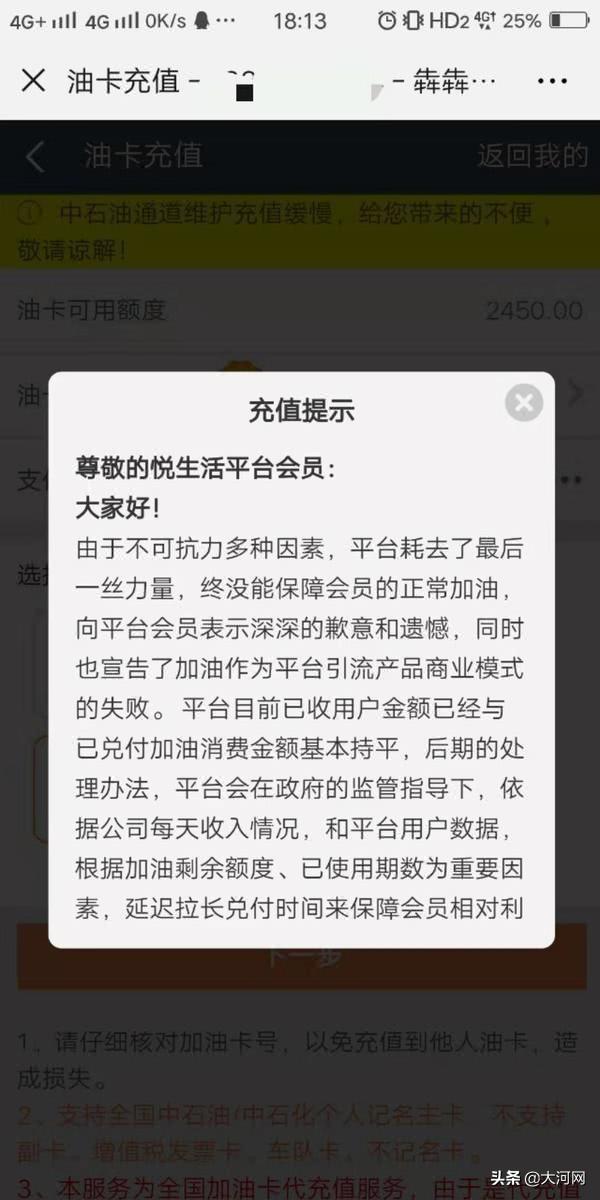直充可享8.3折优惠,信用卡充值可享8.8折优惠。这样的优惠让每天开车上下班的不少郑州市民心动。可是他们通过app购买的油卡套餐,还没用一半,就不能正常加油了。 App上买的加油卡套餐 突然没法用了 近日,郑州市民贾先生拨打河南商报维权热线反映,去年4月,他在一款名为“犇犇悦生活”的App上,花5020元购买了价值6000元的油卡套餐。按照套餐约定,6000元油卡钱分12期激活到贾 先生的账户里,每月一期,然后再兑换成油卡。可是在用了三期之后,油卡钱虽然还在按期激活,可是却不能兑换油卡了。 “我平常上下班都要开车,一个月光油费都得400多。这个App提供的套餐优惠力度很大,买的时候感觉能省不少钱。”贾先生说,App油卡套餐购买方式有两种,直接一次性购买可以打8.3折 左右,用信用卡分期付款购买可以打8.8折左右。 “买了套餐后,每月15日左右都会给我的账户激活500元油卡钱,可去年8月开始,激活的钱不能正常使用了。”贾先生说,后来自己到App所属公司交涉了几次,又正常使用了俩月,然后到现 在就一直不能用了。
