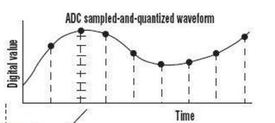 数字信号通过对模拟采用得到 由微积分原理可以知道dx越小近似的图形面积越接近真实面积。由上图也可以看出,采样的点越多得到的数字信号就越接近模拟信号。电脑屏幕分辨率越高我们看到的画面越清晰就是这个道理。