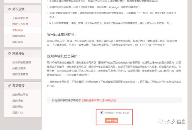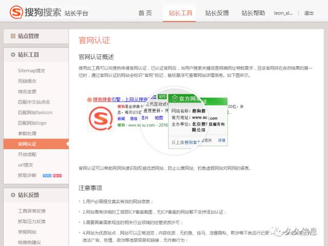 5、确认后等待审核结果 中文站点名、icon、logo的审核周期一般为7-10个工作日,注意是工作日,这仅仅是基础信息审核时间不包括官网认证时间。据搜狗官方说法,官网认证成功后上线时间为10-14个工作日,你懂的。 官网认证基本条件 1、用户需提交真实有效的网站信息。 2、网站需有完整的工信部ICP备案截图,无ICP备案的网站暂不支持添加认证。 3、须具备国家规定的相关行业领域的经营资质许可。 4、网站为优质站点,网站已被搜狗搜索收录,网站可以正常浏览,内容优质,无钓鱼、挂马、泄露隐私、欺诈等不良运行记录,无重大安全隐患,无违法广告,色情、政治等违禁信息和链接,无作弊行为。 5、包含个人姓名的博客、医疗机构类网站、金融理财类网站、P2P网贷类网站,暂不支持添加认证。 官网认证注意事项 1、官网认证有效期为一年,从认证通过日期开始计算,到期后请重新提交认证申请。 2、当某关键词对应官网出现争议时,即第三方认为此认证侵犯其权益时,搜狗搜索有权变更或取消认证。 3、网站名称为全网唯一且与工信部ICP备案、网站标题、网站logo、网站内容等相符。 4、如ICP备案含有多个域名,请提供与网站页面底部相符的完整备案号,不能省略"-*"标识,如:京ICP备11001839号-1。 5、上传材料需完整、清晰、有效:ICP备案截图为工信部ICP备案查询页面完整截图,企业法人营业执照需含年检部分,身份证需为正反面在同一页上。 |