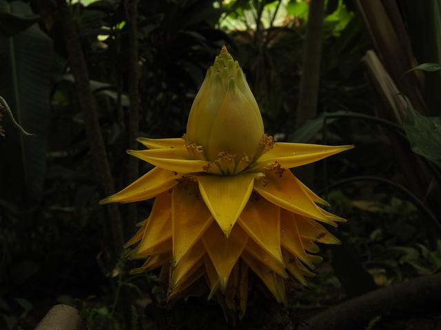 地涌金莲,金黄色“花朵”其实是它的苞片,真正的花隐藏在苞片之间。开花期间所有苞片逐次开放,外观形似佛教中的莲花宝座,十分壮丽,花期最长可达8个月之久。