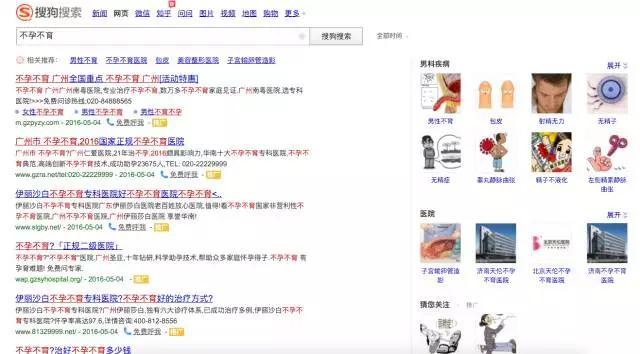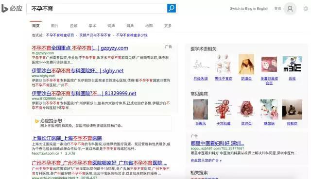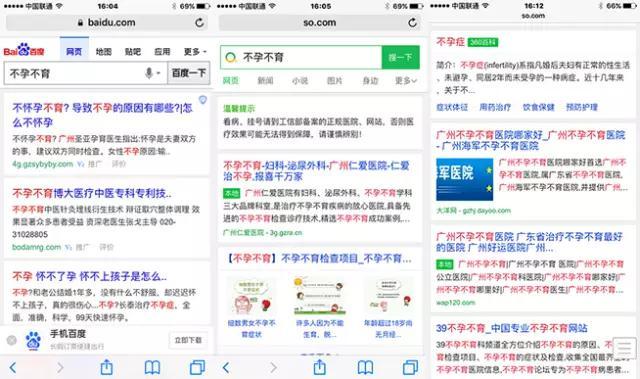 与此同时,其他搜索引擎可能由于害怕受到波及,也将这些推广内容下线了。尤其是已经喊出“彻底清除医疗广告业务”口号的360搜索,除了清除相关内容,甚至还会给出“看病、挂号请到工信部备案的正规医院、网站,否则医疗效果可能无法得到保障,请谨慎辨别!”提示。 当然,也不是搜索所有疾病都能在百度得到清爽干净的结果,目前还有不少词汇在做推广,比如“皮肤病”、“不孕不育”等词汇。我们现在就在百度、360搜索、有道搜索、搜狗搜索以及必应这五大搜索引擎中搜索“不孕不育”这个词看看到底都是些什么结果。 百度满屏推广,标签不明显 现在在百度搜索“不孕不育”,得到的结果是让人震惊的:不仅有推广,且整个首屏都是推广,占满了我的13.3英寸屏幕。这些推广看起来和普通信息几乎一模一样,只有小小的灰色“推广”二字可以加以区分。或许是百度还未来得及清理,或许是百度并未下定决定和医疗推广划清界限,但不管怎样,看到这样的结果,还真是让人挺抗拒的。 360搜索无推广,有提示 在360搜索“不孕不育”,首先十分显眼的绿色提示就让人觉得很靠谱。第一个结果是不孕不育相关卡片信息,点击详情进入的是360健康具体页面。第二个结果也是以科普信息为主。不过往下拉,就看到了一家民营医院的官网,这条信息不仅字体颜色字号和其他信息一样,连“推广”标签也没有。或许,这家医院的SEO真的很强吧。