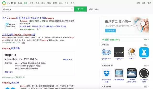 不过话说回来,在搜索其他词汇的时谷歌明显更靠谱。例如,只有在谷歌搜索“Dropbox”我才能在首位找到Dropbox官网,以上五个搜索引擎都不能,有些甚至在第一屏都看不到官网的影子。 当然,除了医疗信息,我们在生活中更多搜索的是一些普通词汇。普通词汇得到的结果也和上面这些情况类似,眼下甚至更糟糕。比如我曾经搜索过Dropbox,由于这样的工具并不像疾病一样受关注,因此得到了更多的推广结果,只是每个引擎标注推广的方式不同罢了。值得注意的是,虽然360要抛弃医疗广告值得赞赏,但它在其他内容的推广标示上和百度一样不明显。也就是说,要搜索普通信息的话,必应和搜狗更容易让你看出来谁是广告。