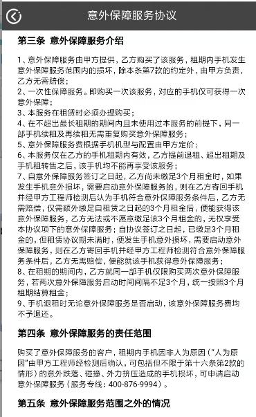 我也搞不懂为什么写的这么绕口,我用我的语文水平好好理解了下,大体是这个意思:这个服务你买一次,出一次事就管用一次,下次出事还要再买(第二条),这个服务的钱是出租手机公司说了算的(第五条),你租手机必须买(第3条)。 重点来了:特别是第7.8条,我好不容易理解明白了 你租了手机,买了保险,如果3个月(从买保险那一天算起)内出了事,还在保险赔偿范围内,那么你把手机寄回去,无需赔偿损失,但是要把前3个月租金交上;如果你不交上前3个月租金,那么保险不赔;如果是3个月之后出的事,保险可以赔偿,你不需要赔偿,不需要要再交钱。(第7条) 假设我手机出事了,然后用了一次保险,公司给我修好了,再寄给我,我还可以再买一次保险(一部手机只能买两次),过了几天(与手机拿回来相隔不到3个月)又出事了,那么按3个月算租金(既第7条补交3个月租金才能理赔)(第8条) 这个保险为什么这么规定我也不清楚,这里也不讨论了 那么看看这个保险是保什么的吧!在保障协议中并没有写明,我在下边的介绍中找到的