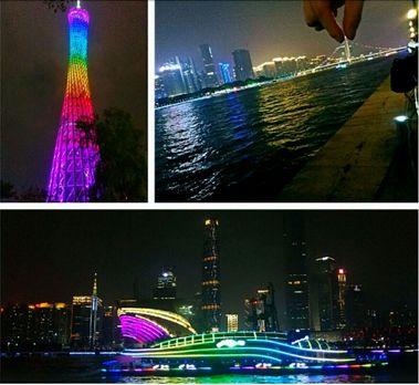 在上下九步行街吃好喝好之后呢,晚上7点多的时候就出发去广州塔,珠江边看夜景咯。 从上下九步行街坐地铁到广州塔,小蛮腰的夜景真的无法用语言来表达了。当然过你想上塔俯瞰广州的话,建议还是在美团或者其它app上提前预购票吧,我个人觉得票价有点小贵。 珠江夜游想想就很美,我们只是在珠江边走了走,江风吹着十分的舒服,如果你想体验一把江上渡轮,那么可以在售票处购票,票价45至90不等。 来来来,欣赏一下广州塔,珠江的夜景吧。