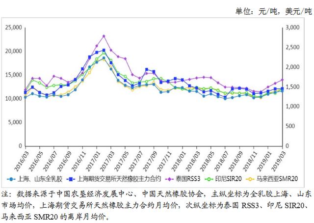 (一)国内部分产区开割,国外主要产区仍处割胶淡季。 本月下旬,我国云南西双版纳、海南东南部部分胶园开始割胶,泰国、印度尼西亚等主要国外主产区仍处割胶淡季。 (二)天然橡胶现货价格上涨。 国内市场,3月全乳胶上海、山东市场均价每吨11513元,环比涨1.4%,同比跌0.3%;混合胶山东市场均价每吨11538元,环比涨3.7%,同比涨5.1%。东南亚市场,泰国RSS3均价每吨1673美元,环比涨5.2%,同比跌3.1%;印尼SIR20均价每吨1460美元,环比涨9.0%,同比跌1.8%;马来西亚SMR20均价每吨1449美元,环比涨3.8%,同比跌0.8%。 (三)天然橡胶期货价格下跌。 3月份,本月上海期货交易所主力合约(1905)均价每吨11957元,环比跌1.1%,同比跌2.5%。东京工业品交易所橡胶主力合约(1908)结算均价每千克193.9日元(折人民币11733元),环比涨0.9%,同比涨3.0%。 (四)天然橡胶进口减少,混合橡胶进口减少。 据海关统计,2月份我国进口天然橡胶10.67万吨,环比减38.6%,同比减3.5%;复合胶0.49万吨,环比减43.0%,同比减21.0%;混合橡胶17.95万吨,环比减45.0%,同比增4.6%。1-2月累计,进口天然橡胶28.06万吨,同比减19.5%,进口额为3.46亿美元,同比减31.6%;进口复合橡胶为1.35万吨,同比减15.6%,进口额为0.50亿美元,同比减12.3%;进口混合橡胶为50.58万吨,同比增3.6%,进口额为6.61亿美元,同比减10.1%。 (五)国内橡胶库存略增。 上海期货交易所截至2019年3月22日天然橡胶库存44.38万吨,环比增1.4%,同比增0.2%。 (六)预计后期天然橡胶价格上涨概率不大。 4月份,预计马来西亚、印度尼西亚等国家仍处于停割期,泼水节后泰国、越南等产区将陆续开割,天然橡胶供给有所增加,但新胶供给仍然偏低。上海期货交易所库存继续增加,保税区内外仓库橡胶库存也居于高位,对后期价格形成高压态势。美国延期对我国轮胎双反加征关税,下游企业开工率稳中略增,截至3月22日,山东地区轮胎企业全钢胎开工率75.3%,环比增长0.7%,国内轮胎企业半钢胎开工率为70.9%,环比增长0.6%,整体看,下游需求不旺,对胶价拉动作用有限。综上,若如无突发事件,预计后期天然橡胶价格上涨概率不大。 |