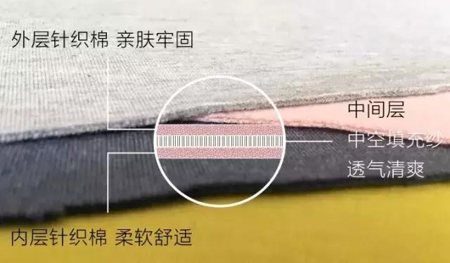 精选的空气层面料 与肌肤一起呼吸 设计师选择了招人喜欢的空气棉为材质,这个空气层采用三明治式结构的针织面料,表面棉涤纶混纺,亲肤牢固,柔软舒适;中间一层采用蓬松性好、弹性好的填充纱形成静止空气层,不勾丝,不缩水,不易皱,可机洗。