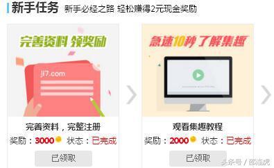 第二个,新手入学 新手入学里,有一些新手任务。比如,完善资料可以奖励3000金币,看下集趣教程也有2000金币的奖励,再完成一个体验任务,可以获得2元奖励。