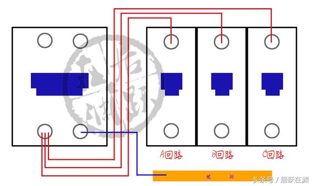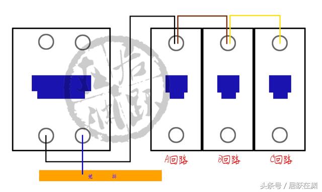 上图中,黑色电线承载的电流,是A,B,C三个回路的电流之和;棕色线承载的电流,是B,C回路电流之和。换句话说,黑色电线承载的电流,和入户线承载的电流大小是一样的。但是,黑色电线属于配电箱内线,它的选择标准是和入户线不一样的。 箱内线,一般为4平方毫米或2.5平方毫米,4平方毫米的电线,最大载流量为25A以上(数据来源于《GB/T 4706.1-2005》)。一个五孔插座的额定电流是10A,一个三孔插座的额定电流是16A,整个房间会有多少个插座?因此,25A的载流量很明显不够,是会引起电线过载的。 入户线一般为6平方毫米,最大载流量为32A以上,能够满足家用(因此要求家庭总开关的额定电流不超过32A)。 那么,如果我把箱内电线换掉,也换成6平方毫米的行不行?答案是不行!电线太粗,势必会挤压箱内空间,影响散热。家用PZ30箱要求,电线不得超过4平方毫米。 正确的接法为,每有一个支路断路器,就要从主开关下口引出一条线,比如这样▼
