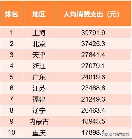 上表可以看出,上海和北京的人均可支配收入是目前最高的两个地区,可以视为第一档;剩下的可以视为第二档;没有列入表中的视为第三档。 有收入必有消费,下面是2017年各地区人均消费支出排行榜。鉴于消费和收入是正相关,故而消费榜和收入榜的排名没有太大的变化,重点关注几个特别的省市。