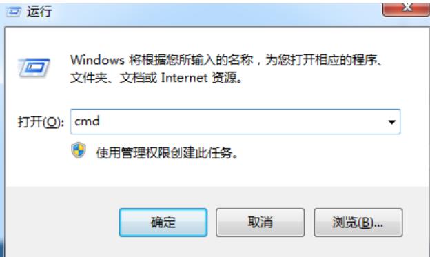 第二步,点“开始”菜单,然后找到并点击“运行”(或者敲击键盘“WIN+R”),然后在打开的运行窗口中输入“cmd”再点确定。